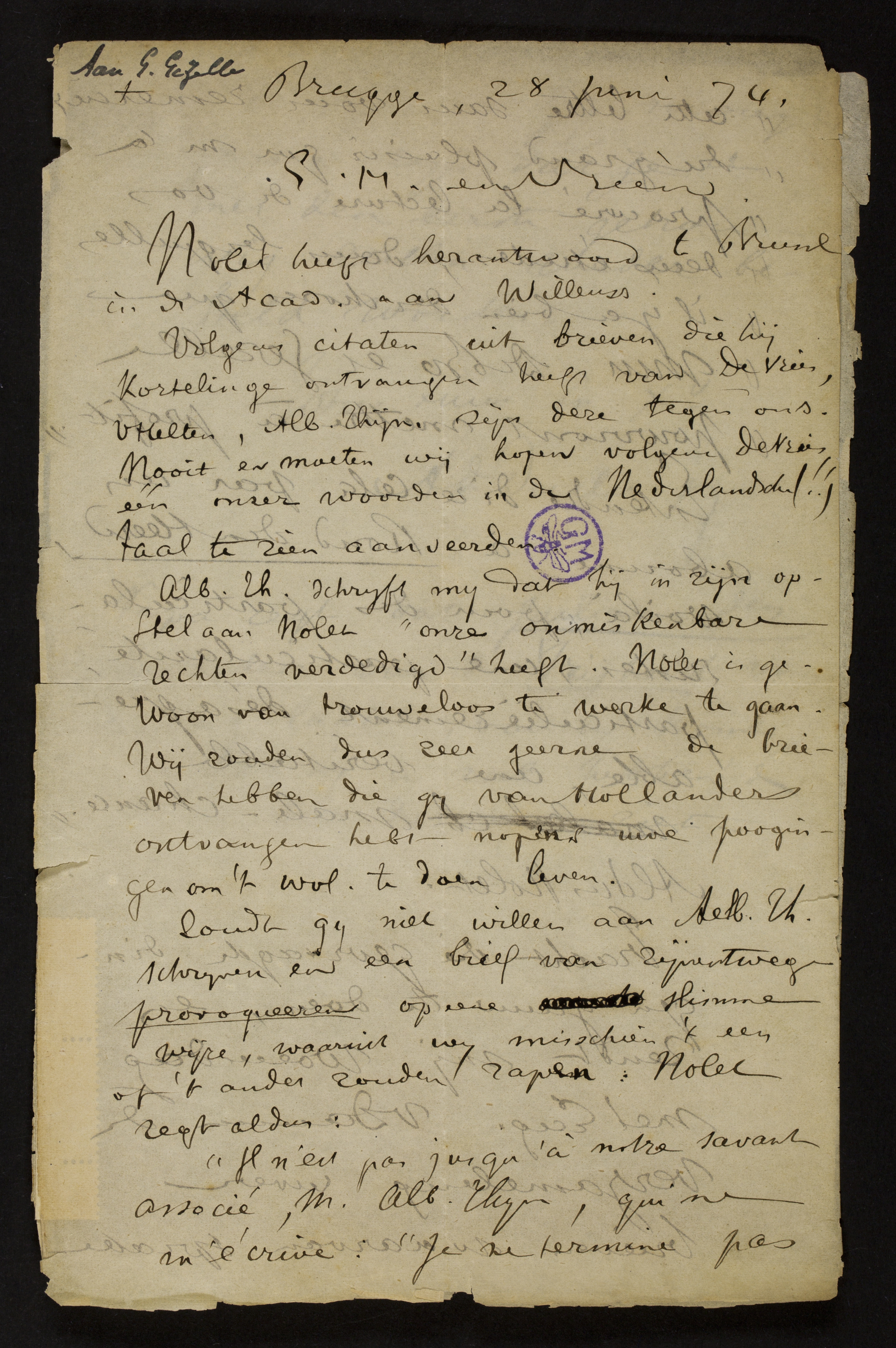 Alb. Th. schrijft mij dat hij in zijn opstel aan Nolet "onze onmiskenbare rechten verdedigd" heeft.[2] Nolet is gewoon van trouweloos te werke te gaan. Wij zouden dus zeer geerne de brieven hebben die gij van Hollanders[3] ontvangen hebt nopens uwe poogingen om 't westvlaamsch te doen leven.
