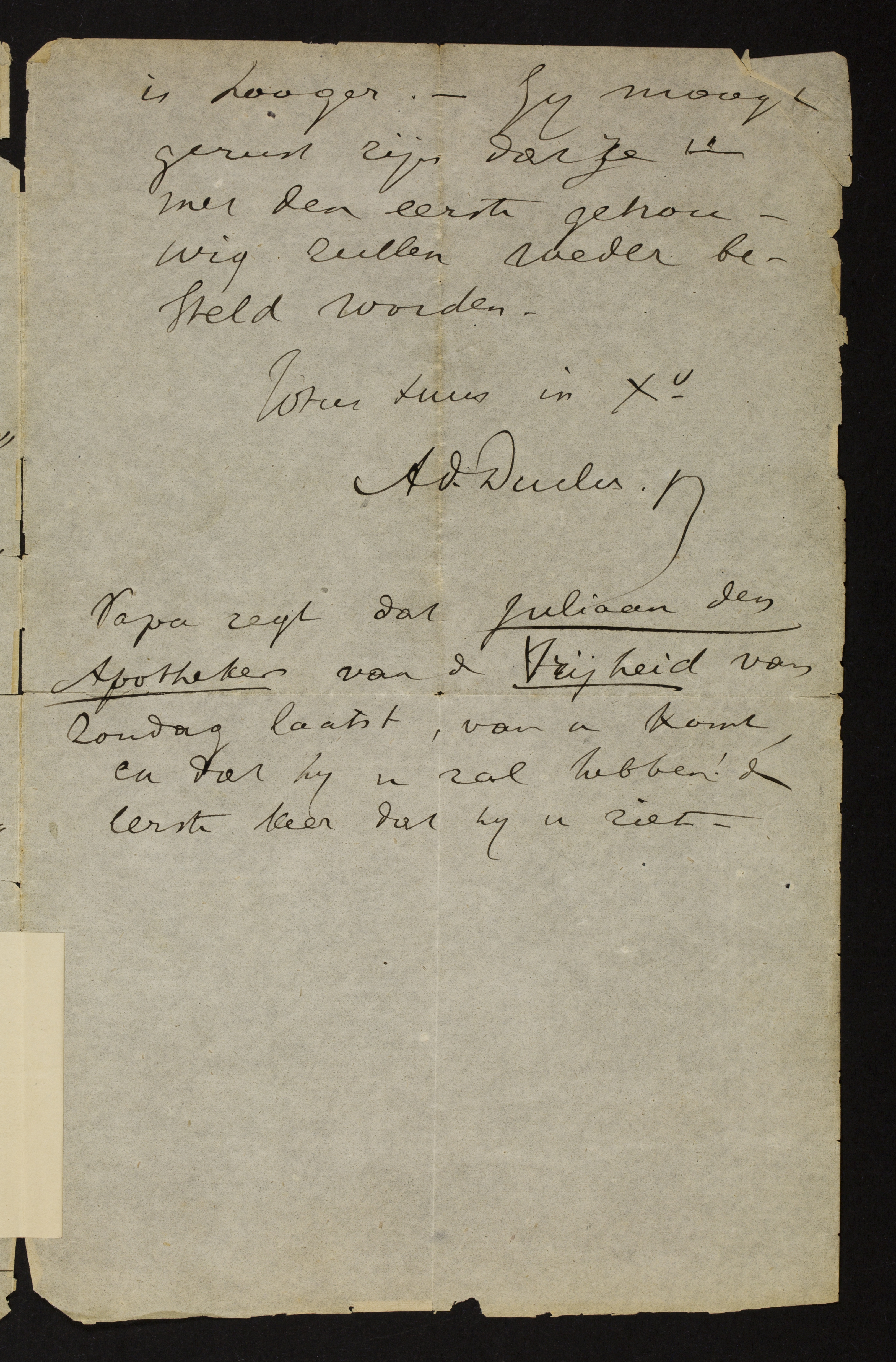 Papa zegt dat Juliaan den Apotheker[6] van de Vrijheid van Zondag laatst, van u komt, en dat hij u zal hebben! de eerste keer dat hij u ziet.