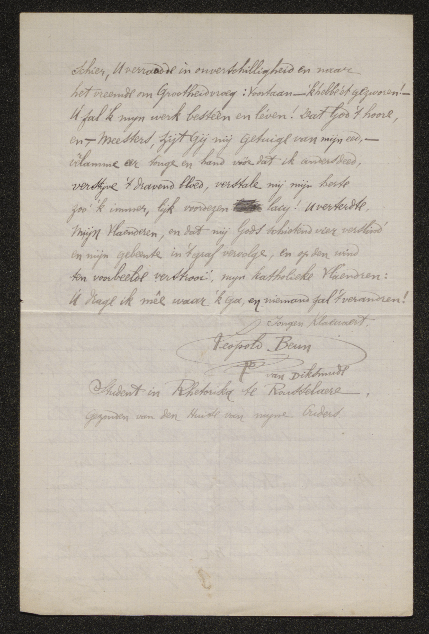 Student in Rhetorika te Rousselaere, gezonden van den Huise van myne Ouders.[9]