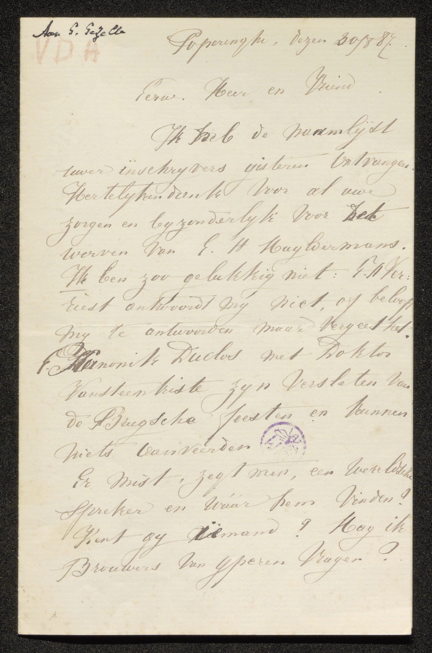 Ik heb de naamlijst uwer inschrijvers[1] gisteren ontvangen. Hertelijken dank voor al uwe zorgen en bijzonderlijk voor het werven van E.H Muyldermans. Ik ben zoo gelukkig niet: E.H Verriest antwoordt mij niet, of belooft mij te antwoorden maar vergeet het. E. Kanonik Duclos met Doktor Vansteenkiste zijn versleten van de Brugsche feesten[2] en kunnen niets aanveerden.
