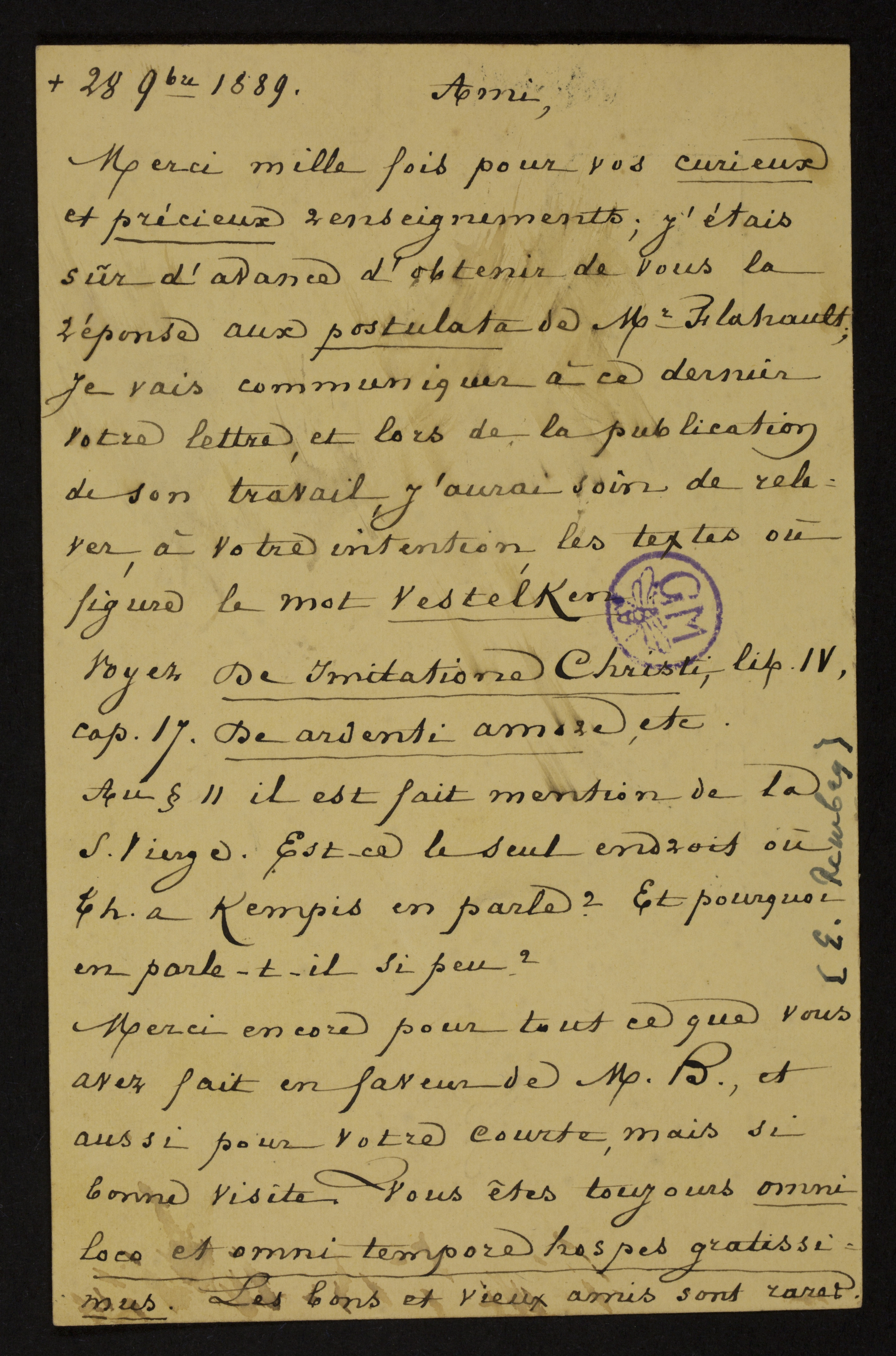 Voyez De Imitatione Christi, lib. IV, cap. 17. De ardenti amore, etc. Au § II il est fait mention de la S. Vierge. Est-ce le seul endroit où Th. a Kempis en parle? Et pourquoi en parle-t-il si peu?