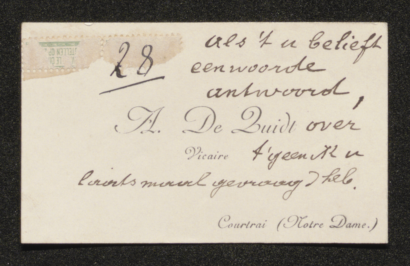 | Bio | Amand(us) Cornelius De Quidt was de zoon van Joannes De Quidt, werkman, en Fidelia Duponcheau. Hij werd op 4 juni 1887 tot priester gewijd in Brugge. Zijn loopbaan begon als onderpastoor in Schuiferskapelle (van 20 april 1888 tot 20 november 1890), gevolgd door Esen (20 november 1890 tot 20 september 1893) en Kortrijk (20 september 1893 tot 27 februari 1901), waar hij verbonden was aan de O.L.Vrouwekerk. Daar moet hij Guido Gezelle hebben gekend. Op 27 februari 1901 nam hij ontslag om naar de Verenigde Staten te vertrekken, waar hij zich in Danvers vestigde. Vanwege gezondheidsproblemen keerde hij echter terug naar België. In oktober 1914 werd hij benoemd tot directeur van de zusters Paulinen, een functie die hij tot oktober 1932 bekleedde, waarna hij ontslag nam. Hij overleed in 1936 in zijn geboortestad Poperinge. |