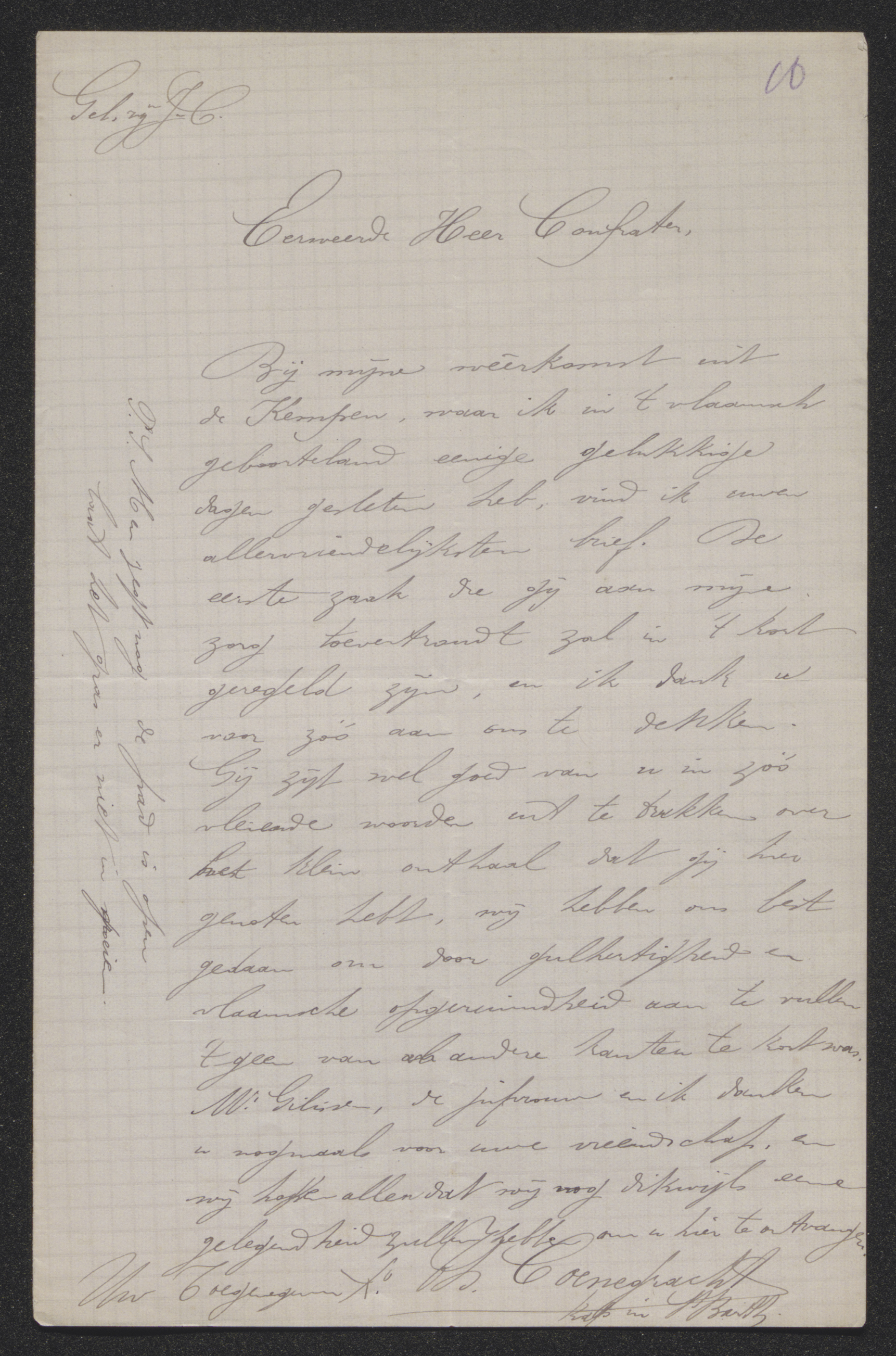 Bij mijne weêrkomst uit de Kempen,[1] waar ik in 't vlaamsch geboorteland eenige gelukkige dagen gesleten heb, vind ik uwen allervriendelijksten brief. De eerste zaak die gij aan mijne zorg toevertroudt zal in 't kort geregeld zijn, en ik dank u voor zóó aan ons te denken. Gij zijt wel goed van u in zóó vleiende woorden uit te drukken over het klein onthaal dat gij hier genoten hebt,[2] wij hebben ons best gedaan om door gulhertigheid en vlaamsche opgeruimdheid aan te vullen 't geen van al andere kanten te kort was. Mr. Gilissen,[3] de jufvrouw en ik danken u nogmaals voor uwe vriendschap, en wij hopen allen dat wij nog dikwijls eene gelegendheid zullen hebben om u hier te ontvangen.