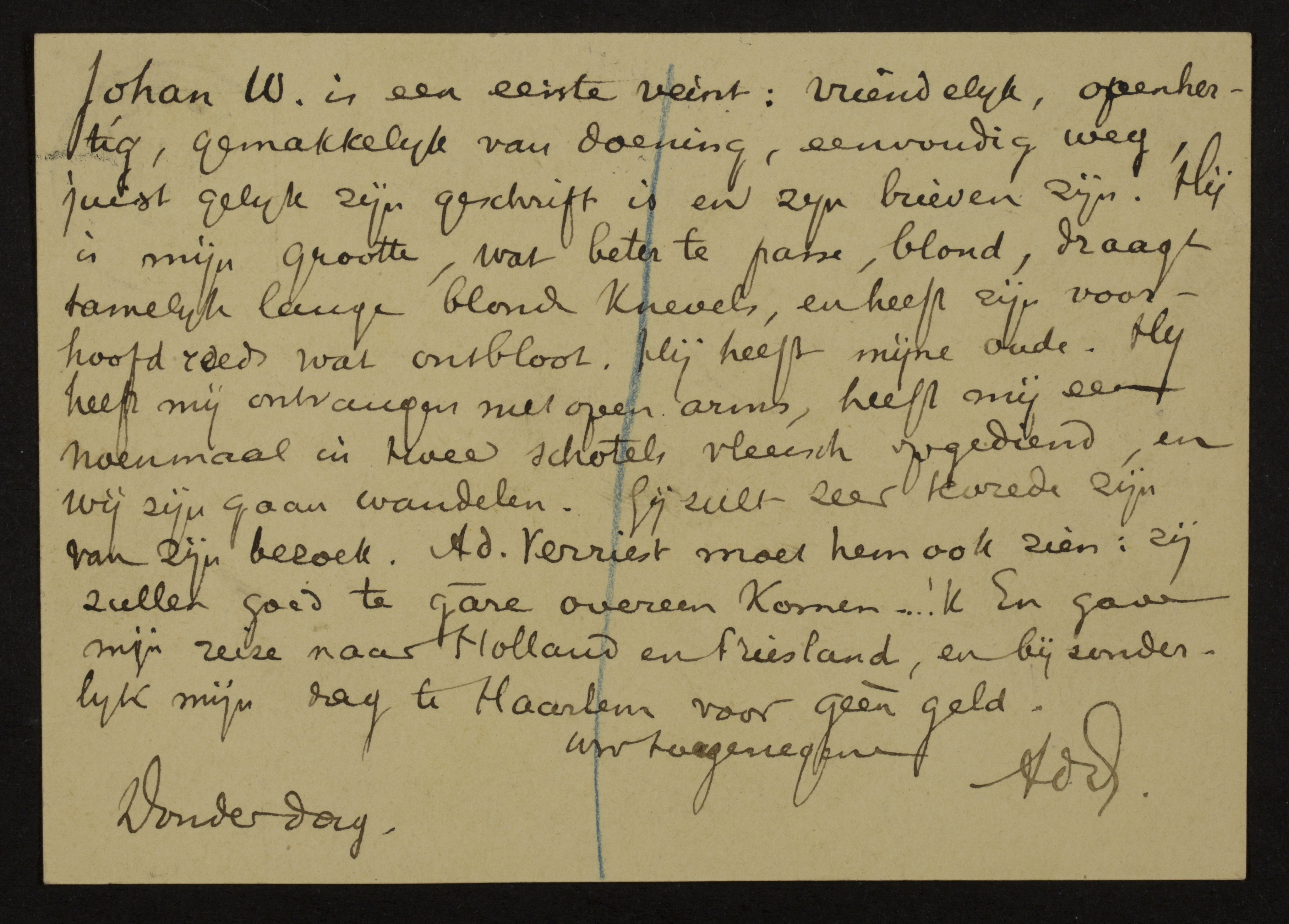 Johan W. is een eerste veint: vriendelijk, openhertig, gemakkelijk van doening, eenvoudig weg, juist gelijk zijn geschrift is en zijn brieven zijn. Hij is mijn grootte, wat beter te passe, blond, draagt tamelijk lange blonde knevels, en heeft zijn voorhoofd reeds wat ontbloot. Hij heeft mijne oude. Hij heeft mij ontvangen met open arms, heeft mij een noenmaal in twee schotels vleesch opgediend, en wij zijn gaan wandelen. Gij zult zeer tevrede zijn van zijn bezoek.[1] Ad. Verriest moet hem ook zien: zij zullen goed te gâre overeen komen … 'k En gave mijn reize naar Holland en Friesland,[2] en bijzonderlijk mijn dag te Haarlem voor geèn geld.