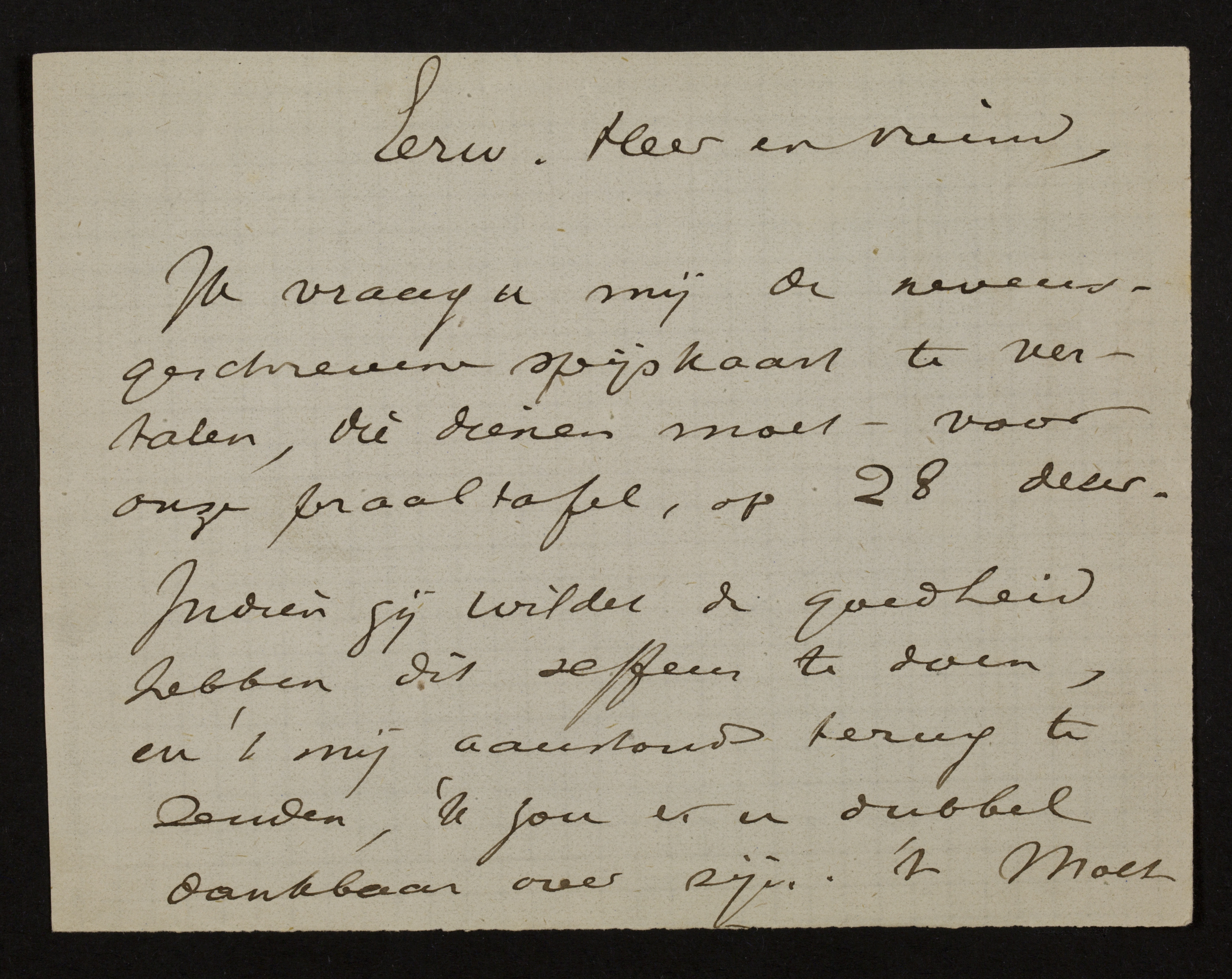 Ik vraag u mij de nevensgeschrevene spijskaart[1] te vertalen, die dienen moet voor onze praaltafel, op 28 dezer. Indien gij wildet de goedheid hebben dit seffens te doen, en 't mij aanstonds terug te zenden, 'k zou er u dubbel dankbaar over zijn. 't Moet …