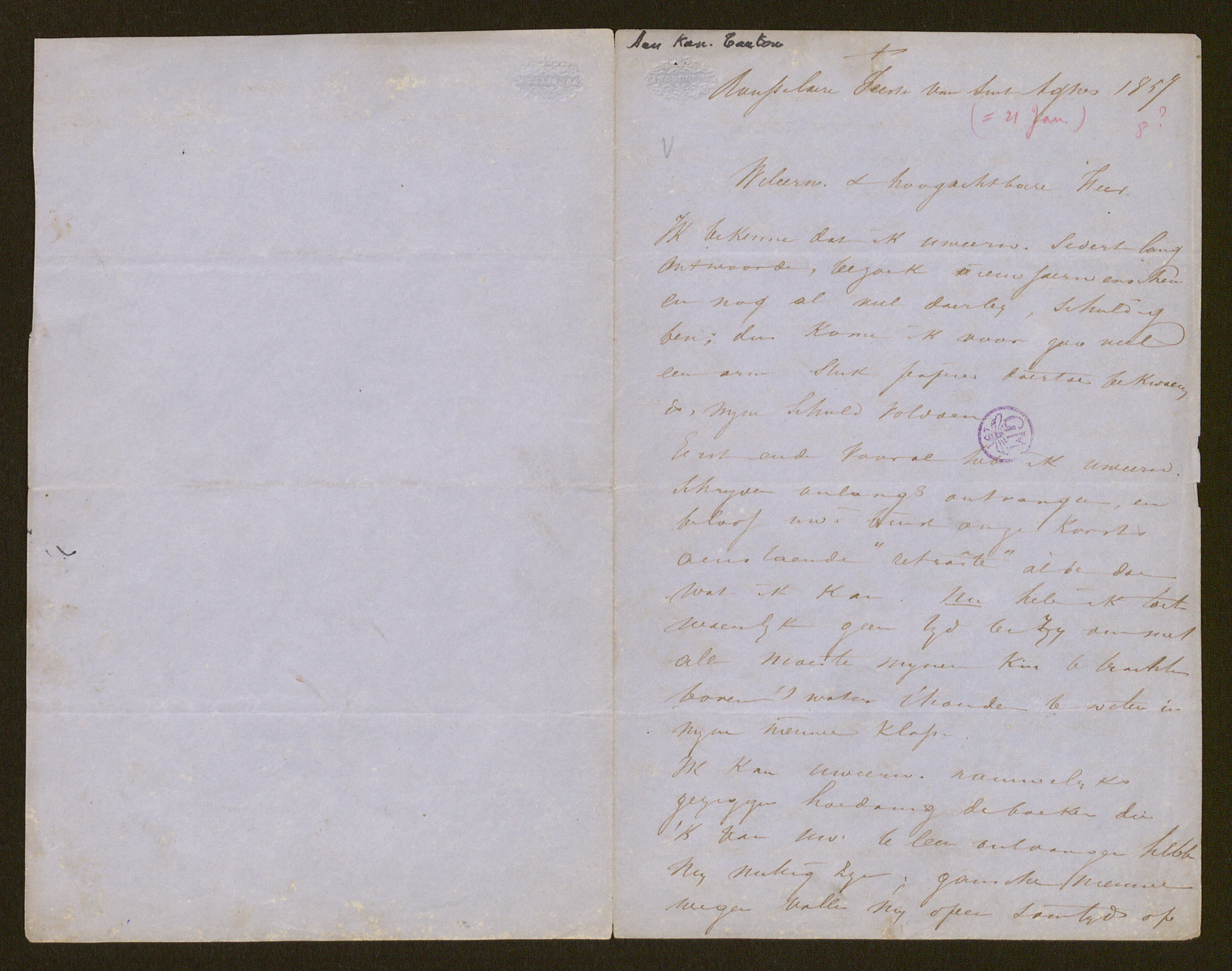 Ik bekenne dat ik Uweerweerde sedert lang antwoorde, bezoek nieuwjaerwenschen en nog al veel daerby, schuldig ben; dus kome ik voor zoo veel een arm stuk papier daertoe bekwaem is, myne schuld voldoen.