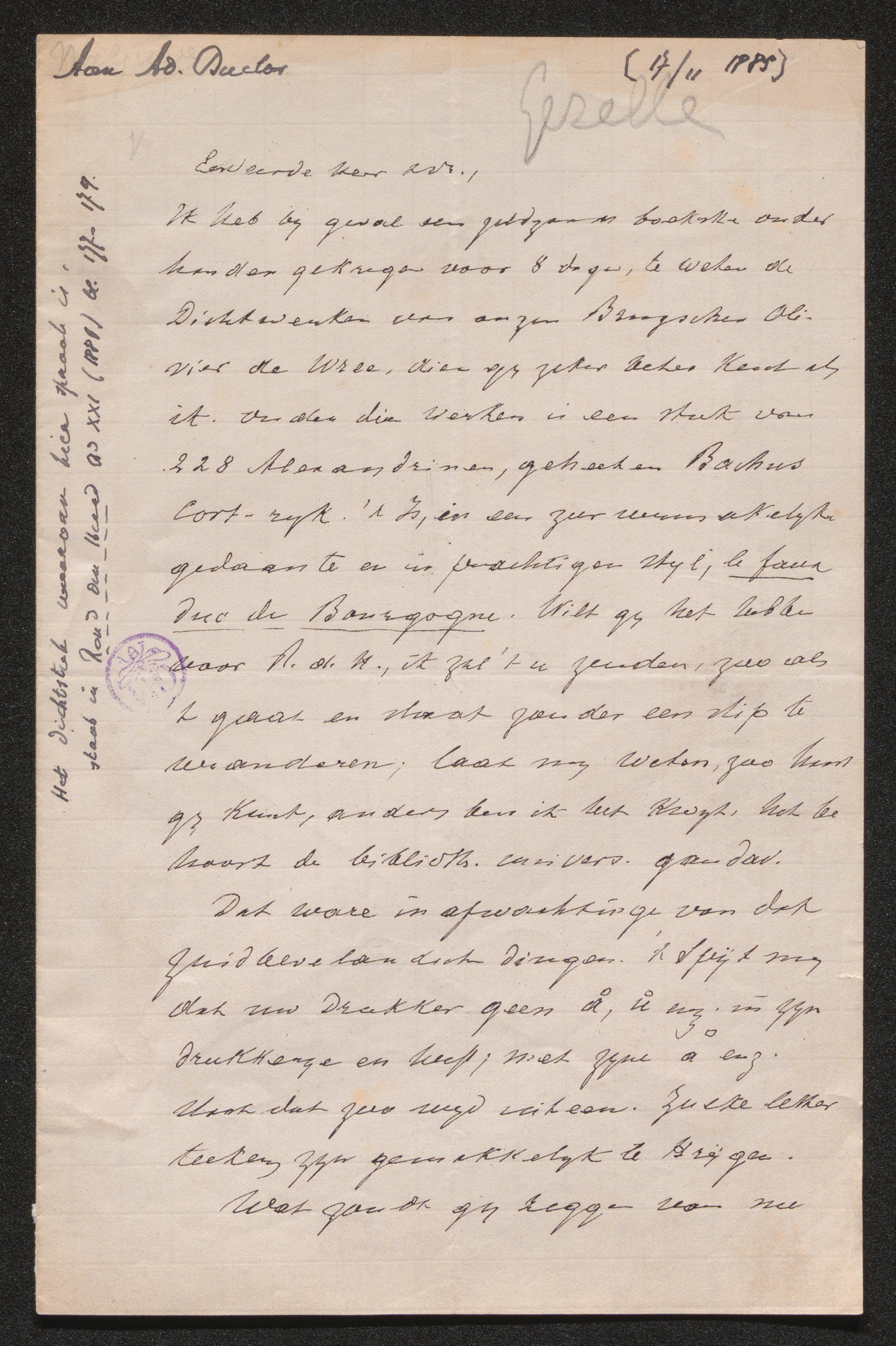 Ik heb bij geval een zeldzaam boekske onder handen gekregen voor 8 dagen, te weten de Dichtwerken van onzen Brugschen Olivier de Wree, dien gij zeker beter kent als ik. Onder die werken is een stuk van 228 Alexandrinen, geheeten Bachus Cort-ryk.[1] t Is, in een zeer vermakelijke gedaante en in prachtigen stijl, le faux duc de Bourgogne.[2] Wilt gij het hebben voor R. d. H., ik zal 't u zenden, zoo als 't gaat en staat zonder een stip te veranderen; laat mij weten, zoo haast gij kunt, anders ben ik het kwijt, het behoort de biblioth. univers. gandav.