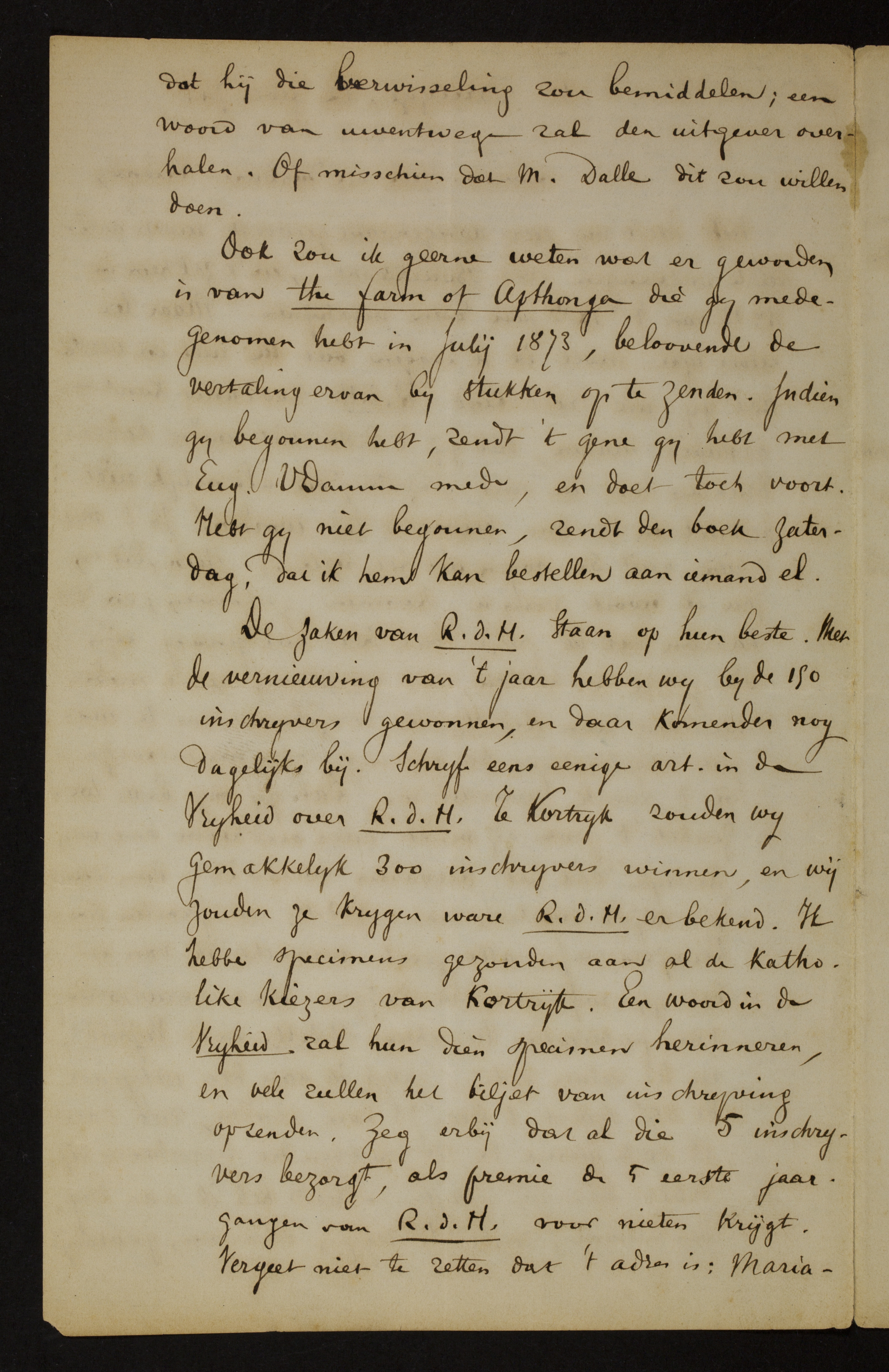 Ook zou ik geerne weten wat er geworden is van the farm of Apthonga die gij medegenomen hebt in Julij 1873, beloovende de vertaling ervan bij stukken op te zenden.[4] Indien gij begonnen hebt, zendt 't gene gij hebt met Eug. VDamme mede, en doet toch voort. Hebt gij niet begonnen, zendt den boek zaterdag, dat ik hem kan bestellen aan iemand el.[5]